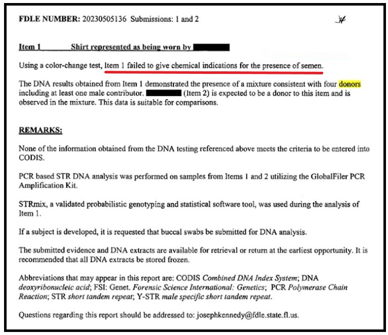 O laudo da blusa vermelha (apresentada por Haline para exame forense) identificou DNAs de 4 pessoas, inclusive de Marcus. Aliás, fato absolutamente esperado, já que se trata da roupa de sua própria filha e o DNA pode ser transferido por simples contato. O exame foi negativo para material genético masculino de natureza biológica (secreção). Portanto, não houve qualquer comprovação de sêmen ou fluido corporal presente na roupa usada por Livia aquela noite. O que fica explícito no exame oficial que mostramos ao lado.
